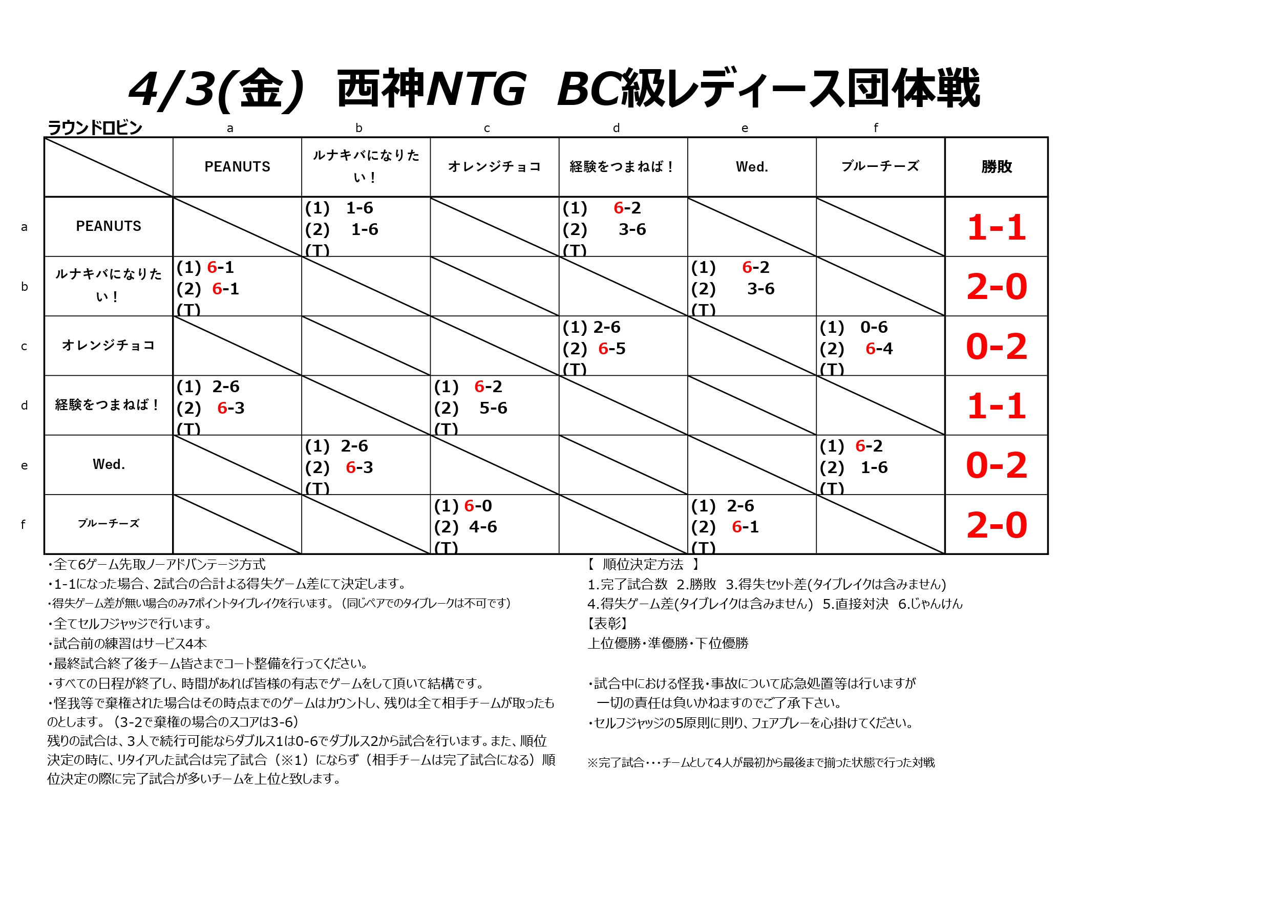 4/3(金)に行われました西神級LTBC級団体戦の試合結果です✌️