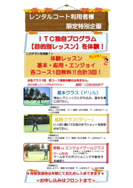 ただいま、西神テニスガーデンではレンタルコート利用者限定体験レッスンご招待キャンペーンを開催中!