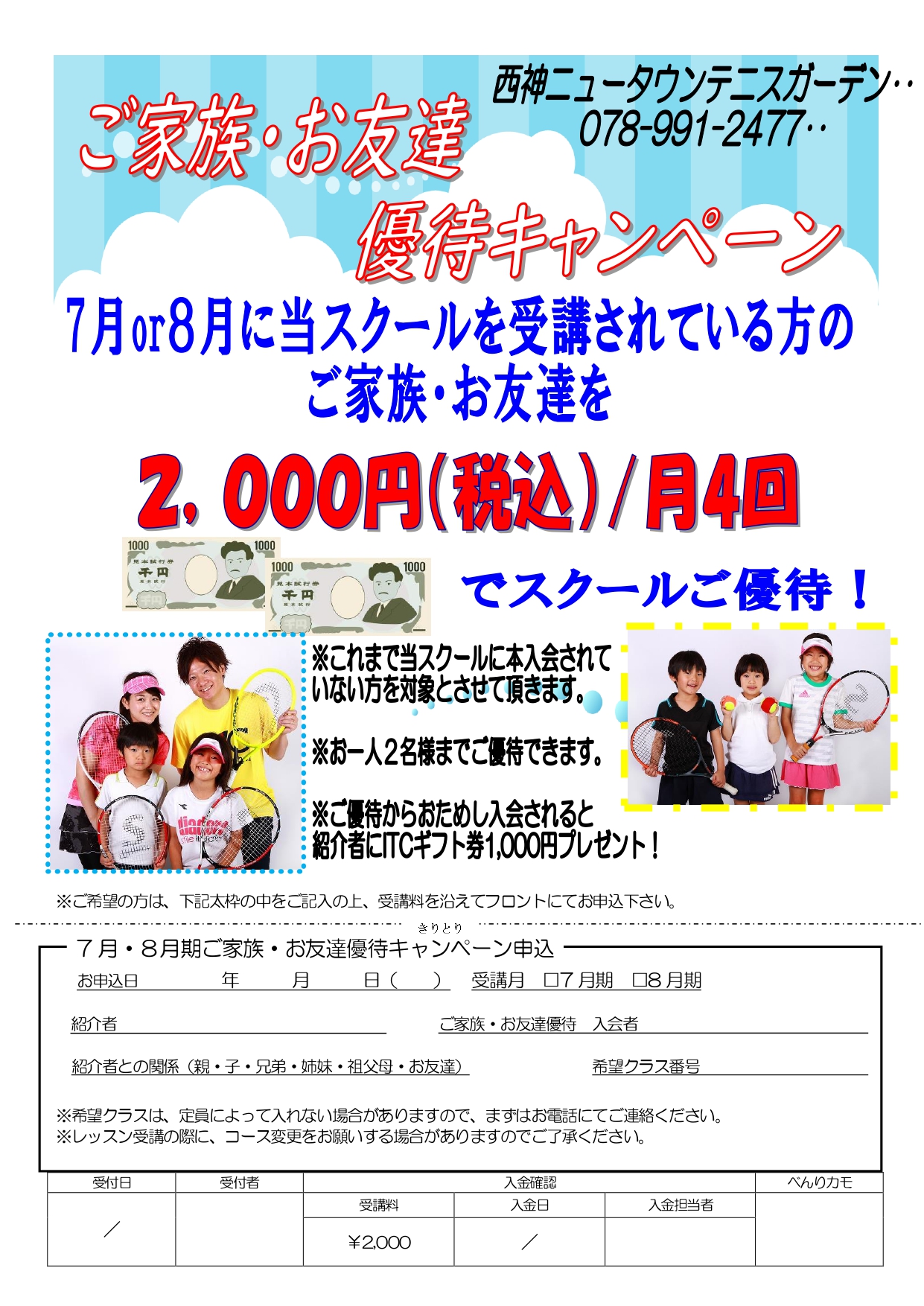 7月・8月にスクールを受講されいる方のご家族・お友達を2,000円(税込)/月4回でスクールご優待!!!