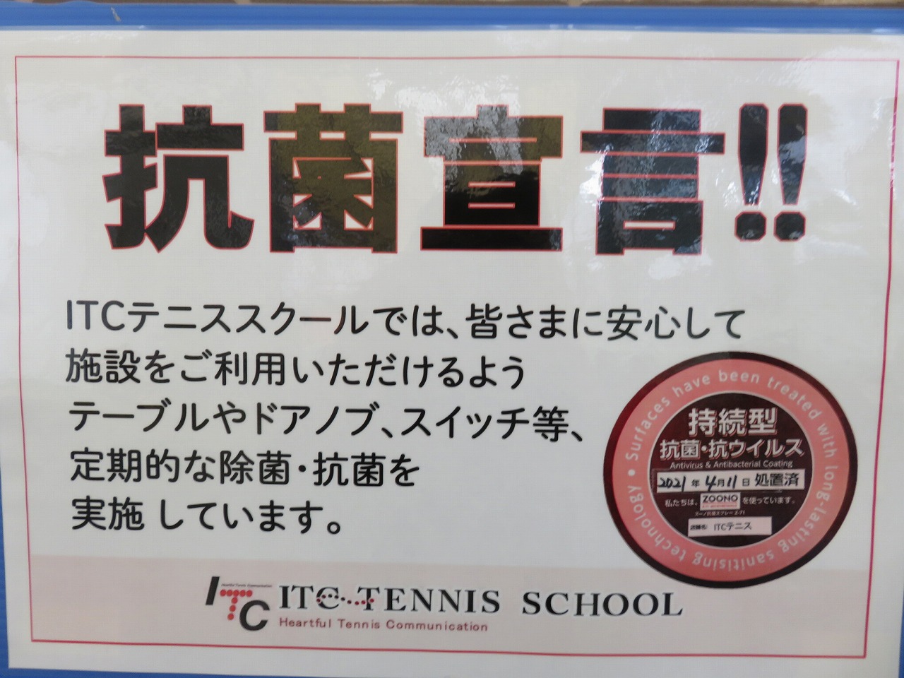ITC与野インドアテニスクラブでは、ズーノ【ZONO】抗菌スプレーによる施設内消毒を行っています。